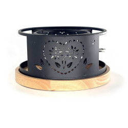 Fondue-Rechaud EDEL BLACK aus Edelstahl und schwarz gebeiztem Hevea-Holz mit Gelbrenner aus Edelstahl. Der Durchmesser des oberen Teils beträgt 175 mm, der der Basis 220 mm. Es ist sehr stabil und für alle Caquelons bis zu 23 cm Durchmesser geeignet. Die Herstellung des Rechauds ist für intensive oder professionelle Nutzung ausgelegt, Reinigung per Hand.